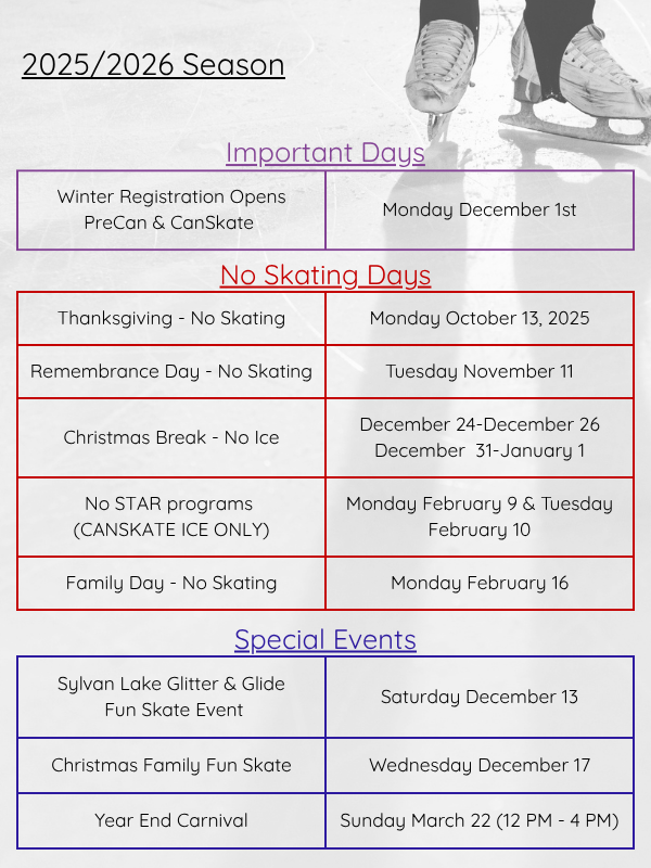 Glitter & Glide Fun Skate for skaters in CanSkate Stage 5 and 6 and Star 1-3. Registration will open for SLFSC skaters October 20 and to surrounding clubs November 1st. Registration will close on November 30.